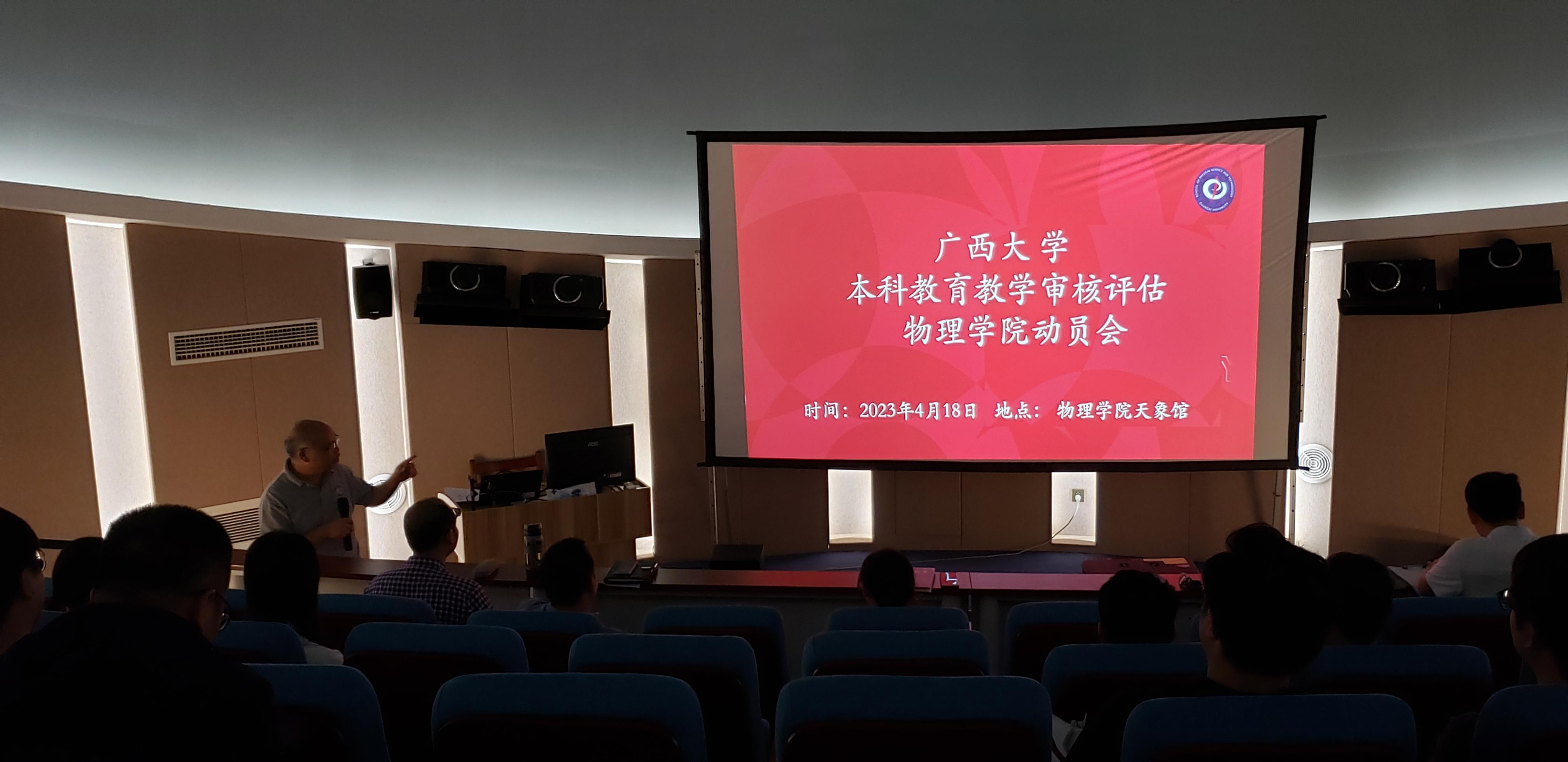 在学院天象馆召开本科教育教学审核评估动员大会,院长梁恩维主持会议,全体教职工参加会议。