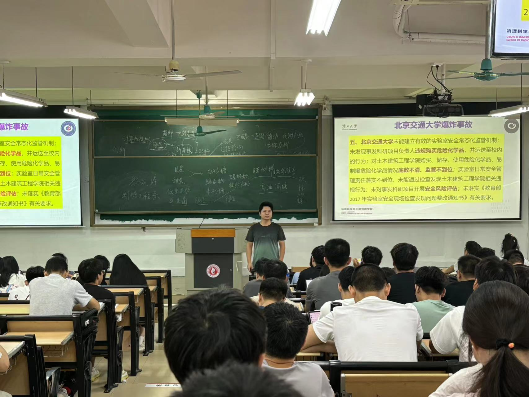 本次实践教学活动分别由陆翔副院长、资源环境与材料学院何娟霞老师以及实验中心潘智毅副主任进行授课。陆副院长从实验室安全的重要性入手,为学生们详细介绍了学院实验室基本情况,重点解读了学校实验室安全8大隐患及其达标要求和排查要点,最后介绍了学校实验室安全专项整治三年行动工作部署,为新生开展安全实验奠定了基础。何老师作为安全领域的专家,从安全专业的角度为新生分析了实验室安全事故诱因,介绍了危险化学品事故及如何有效预防,最后通过典型案例分析为大家详细讲解了实验室常见安全标识,加深了新生对危化品等安全隐患的认识。潘副主任以安全教育的重要性和安全管理的依据为出发点,详细解读了教育部发布的《高等学校实验室安全规范》、《高等学校实验室安全检查项目表(2024年)》和学校出台的《MOTV