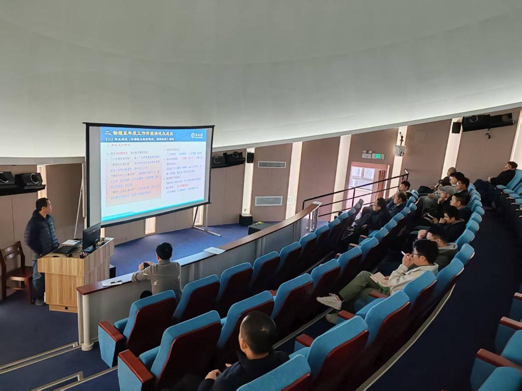 梁毅老师总结汇报了物理系2024年整体工作情况,包含管理分工、人员状况、专业建设、课程与实践建设、教师发展、教育教学改革等,并就2025年的工作计划做出部署和安排。