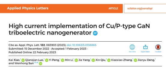 孙文红教授领导的光电材料与器件团队在Nature Index著名学术期刊《Applied Physics Letters》上发表了题为"High current implementation of Cu/P-type GaN triboelectric nanogenerator"的研究论文。该论文被编辑选为"Editor's Pick"文章,在APL官网主页