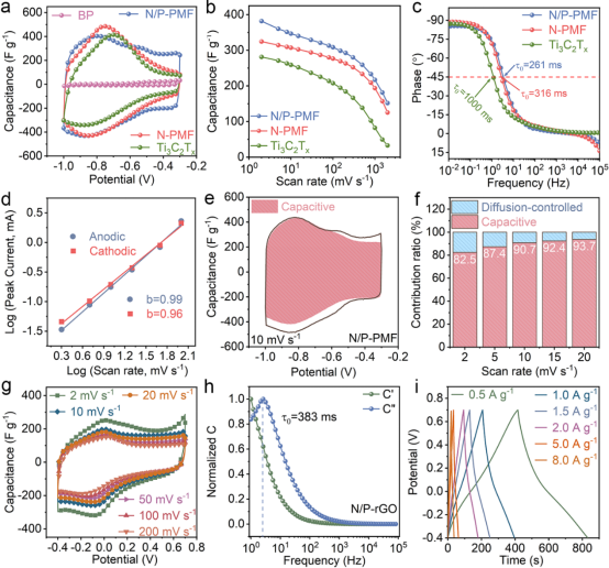 多孔氮掺杂的MXene薄膜(N-PMF)显示出比致密原始Ti3C2Tx薄膜更高的CV积分面积,这可以归因于N掺杂增加了氧化还原活性位点。当引入BP纳米片以获得N/P-PMF复合薄膜时,观察到更大的CV曲线积分面积,表明了增强的比电容。N/P-PMF电极的CV曲线表现出两对在-0.8 V和-0.55 V处的氧化还原峰。前者可以归因于Ti3C2Tx的固有赝电容行为,而后者则与-OP端官能团的氧化还原反应相关。因此,Ti3C2Tx表面的-OP端子能够提供氧化还原活性,并进一步增强电极的氧化还原深度和赝电容能量存储性能。鉴于纯BP薄膜非常小的比电容,说明N/P-PMF的电容并不是简单地将Ti3C2Tx和BP的电容相加,而是归因于引入具有赝电容的-OP端子。值得注意的是,N/P-PMF电极在2 mV s-1时提供了最大的质量比电容381 F g-1。即使在1000 mV s-1时,仍保持高达217 F g-1的电容。N/P-PMF混合薄膜的优异速率性能可以归因于多孔结构促进的改善的离子扩散动力学。N/P-PMF的GCD曲线呈现出接近三角形的形状,表明了快速和可逆的电化学反应,与CV结果一致。同时使用相同的方法合成的具有含氮、磷端子的多孔石墨烯薄膜(N/P-rGO),N/P-rGO不仅保持了较高的正电位窗口(-0.4至0.7 V),而且通过引入氧化还原反应位点增加了比电容,并因为电极结构的优化显现出更小的介电弛豫常数,呈现快速离子扩散的性能。这些结果表明,所提出的结构调控和杂原子修饰相结合的方法有助于改善二维材料的电化学性能。