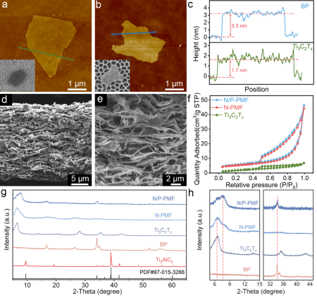采用一步气体辅助发泡法设计并制备了具有氮、磷端子的多孔MXene 薄膜。通过选择性蚀刻Ti3AlC2获得少层 Ti3C2TxMXene 纳米片,并且使用球磨和超声分散法从块体黑磷中剥离出黑磷纳米片(BP)。然后,通过纳米片和铵离子之间的静电相互作用,将 MXene 和 BP 纳米片在碳酸氢铵(NH4HCO3)溶液中进行自组装。利用真空过滤收集复合膜,并在高温热处理后获得具有含氮、磷端子的多孔MXene膜(N/P-PMF)。在热处理过程中,NH4HCO3分解释放出的NH3和CO2气体在薄膜内构成了一个三维互联的多孔结构,并且NH4HCO3能够作为氮源实现对MXene的N掺杂。同时,BP能与MXene表面官能团反应并导致-OP端子的形成。并且,通过使用同样的方法,也能够制备出具有氮磷端子的多孔石墨烯薄膜(N/P-rGO)。
