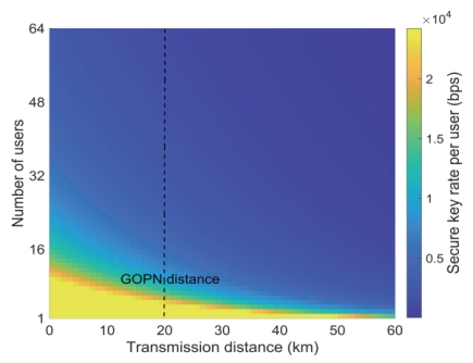 图4:不同活跃用户数下, 64用户容量的量子接入网中每个用户的安全密钥率。