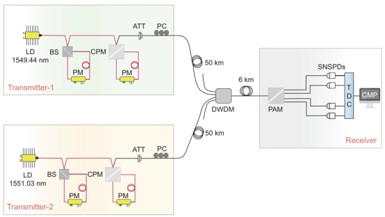 图2:基于qubit同步的上行量子接入网实验装置示意图。