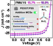 利用含钼半导体材料(Molybdenum-Containing Semiconductors,MCSs)对PEDOT:PSS进行掺杂改性已被证明是改变表面能和改善成膜性的有效手段。然而,MCSs对PEDOT:PSS内在特性的影响却很少被讨论。这限制了此类MCS-PEDOT:PSS层的广泛应用,也使得人们很难进一步探讨其对有机太阳能电池性能的影响。