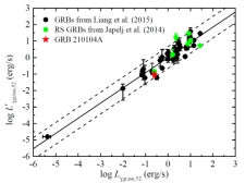 伽玛暴极早期光学余辉对于研究伽玛暴喷流性质和暴周介质环境具有非常重要的意义。博士生张璐璐和导师与国家天文台辛立平研究员等合作,利用兴隆观测基地的GWAC-F60A、TNT望远镜和2.16米光学望远镜对GRB 210104A进行细致的测光和光谱观测,结合多波段观测数据研究这个暴余辉和暴周环境性质。他们光谱观测结果获得了该暴的宇宙学红移为0.46,并在暴后67~152秒的观测到明亮的光学耀发。他们的理论分析表明早期光学辐射是由反向激波辐射主导,晚期的光学辐射则由正向激波主导,而且该暴的喷流为中等相对论、中度磁化(RB = 28),具有较高的辐射效率和较低的动能,暴周环境是致密的星际介质环境。该暴同典型的长伽玛暴在2σ置信度水平内同样遵循Lγ,iso − Ep,z − Γ0三参量关系。研究论文在《天体物理学杂志》(The Astrophysical Journal)发表。