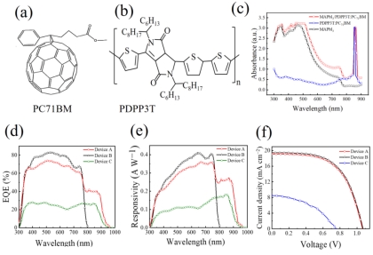 Fig. 2. Molecular structures of PC71BM (a) and PDPP3T (b). UV-Vis absorption spectra of PDPP3T:PC71BM, MAPbI3 and MAPbI3/PDPP3T:PC71BM composite film. The external light quantum efficiency spectra (d), responsivity spectra (e) and current-voltage spectra (f) of the three best optimized devices (device A, device B and device C).