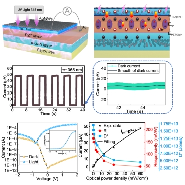 蓝色能源研究团队与西安电子科技大学彭彪林教授合作,以p-GaN作为衬底,在铁电材料PZT中诱导显著的极化场,进而调控TiO2/PZT异质结,增强异质结内建电场。发展的AgNWs/TiO2/PZT/GaN双耦合自驱动紫外光电探测器,在365nm紫外光照射下获得了184.31 mA/W的响应度(R),62%的外量子效率(EQE),1.7×1013 Jones的比探测率(D*),0.16 ms/0.98 ms的快速上升/下降时间,以及8.1×106的高开关比。器件在持续照明下可保持稳定、高效的紫外光探测能力。该研究为发展高性能自驱动光电器件提供了一种有价值的途径。