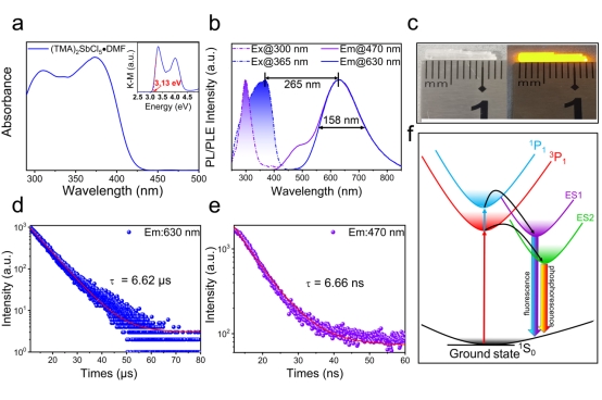 无铅低维有机-无机金属卤化物材料由于其优异的光物理性能和化学稳定性,最近引发了广泛的关注。本团队报告了一种新型的零维有机-无机杂化单晶 (TMA)2SbCl5·DMF (TMA=N(CH3)3, DMF=HCON(CH3)2),其表现出典型的自陷激子STE发射,在 630 nm 处具有高效的黄色发射和 高达67.2% 的发光量子产率。双 STE 发射模式分别归因于无机 [SbCl5]2- 中的单线态和三线态 STE。此外,分子动力学模拟验证了室温下晶体结构的稳定性。理论计算表明激发态结构的畸变程度大于基态的畸变程度,验证了实验中强电声耦合引起的大斯托克斯位移的现象。该类新型的零维无铅有机-无机杂化金属卤化物在光电领域具有重要应用前景。
