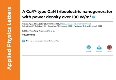 孙文红团队在Nature Index著名学术期刊《Applied Physics Letters》上发表了题为“A Cu/P-type GaN triboelectric nanogenerator with power density over 100 W/m2”的研究论文。该论文被编辑选为“Editor's Pick”文章,在APL官网主页