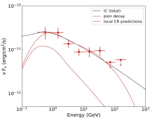 伽马射线为研究宇宙线起源这一“世纪之谜”提供了一个重要探针。有观测表明巨星团可能是银河系内一类重要的宇宙线源。助理教授孙晓娜与中国科技大学学者合作,基于最新的GeV伽马射线观测研究银河系内巨星团Mc20附近HESS J1912+101的高能宇宙线辐射。之前相关研究表明HESS J1912+101周围扩散的GeV辐射起源于由PSR J1913+1011驱动的脉冲星风云,10 GeV以上的GeV辐射与TeV辐射相关联,起源于壳层型的超新星遗迹。不同于前面的结论,我们发现扩散的GeV伽马射线辐射与分子气体具有空间分布一致性,从而支持GeV伽马射线强子起源。我们认为产生这些伽马射线的宇宙线质子可能来自超新星遗迹候选源HESS J1912+101或者巨星团Mc20。