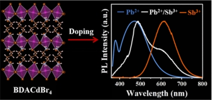 有机-无机杂化金属卤化物因其优异的光电性能而备受关注。然而,二维(2D)杂化金属卤化物由于间接带隙性质而表现出较差的发光性能。本工作通过重结晶方法成功制备了Pb(II)和Sb(III)共掺杂的BDACdBr4单晶,并获得了可调谐的发射。在紫外光激发下,由于具有ns2电子构型的Pb(II)和Sb(III)的本征自困激子发射的色比不同,发光颜色从冷白、白、暖白切换到橙红色。时间分辨光谱表明,随着Sb(II)/Pb(III)掺杂比例的增加,Pb(II)向Sb(III)的能量有效传递。基于该材料在365/395 nm激发下的可调谐发射特性,其具有良好的加密防伪应用前景。该工作为通过金属离子共掺杂策略调整Cd基金属卤化物的光学性能提供了参考。