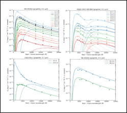 Ibn型超新星是相互作用超新星,其光谱具有由喷射物与富He星周介质相互作用产生的窄He I发射线。此前一些研究在IIn型和Ia-CSM型相互作用超新星中发现了尘埃形成的证据,观测到红外波段辐射超出。至今共有6颗Ibn型超新星同时具有光学与近红外测光观测,此前一个团队发现其中一颗具有尘埃,另一团队发现另一颗没有明显的尘埃形成的证据。还研究小组对另外4颗Ibn型超新星(SN 2010al、OGLE-2012-SN-006、LSQ13ddu与SN 2015G)的多时期能谱进行系统性的研究,发现OGLE-2012-SN-006的能谱相对于光球黑体辐射显示出明显的红外超出,SN 2010al的能谱显示出可能的红外超出,LSQ13ddu与SN 2015G的能谱未显示红外超出。假定红外超出为尘埃辐射所导致,利用超新星光球黑体与尘埃辐射的双成分模型很好地拟合了这四颗超新星的能谱(如图),得到了OGLE-2012-SN-006的尘埃的质量、温度与成分与另外三颗Ibn型超新星的尘埃的质量的上限值,进一步推导出尘埃所在位置的下限值,发现尘埃构成的壳层的半径远大于超新星喷射物的半径,从而证明OGLE-2012-SN-006的尘埃形成于超新星爆发之前,还比较了OGLE-2012-SN-006和其他被认为具有尘埃形成证据的相互作用超新星的尘埃的质量、温度、亮度、位置等性质。审稿人评价这项工作:“This paper presents an important study on the dust in Ibn supernovae……”(“这篇论文给出了对Ibn型超新星的尘埃的重要研究……”)。
