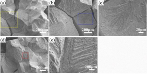 (a), (d) SEM images of the fracture surfaces of the annealed Hf0.8 alloy, (b) is a magnification image of the yellow box in (a), (c) is a magnification image of the blue box in (b), (e) is a magnification image of the red box in (d). [2]
