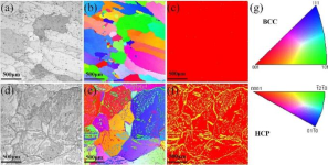 (a), (b), (c): as-cast Hf0.8; (d), (e), (f): the annealed Hf0.8; (a), (d): EBSD Band Contrast map; (b), (e): EBSD IPF maps; (c), (f): EBSD phase map (the BCC phases are colored by red, the HCP phase is colored by yellow). The crystallographic orientations of different grains in (b) and (e) are identified by the color scheme in the IPF triangle (g). [2]