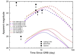 天体物理团队利用LCOGT望远镜,联合西班牙BOOTES望远镜和云南丽江2.4米望远镜对其进行了后随跟踪观测,发现GRB 211227A爆发的位置离宿主星系的距离大约20 kpc,而且没有观测到超新星成分。所以我们认为这个近距离、长时标的伽玛暴可能来自双致密星的并合,同时预言了可能产生的千新星成分也由于太暗,而不能被当前望远镜探测到。这些发现与传统的认识理念正好相反,对研究伽玛暴前身星又提出新的挑战。