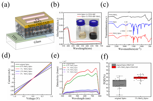 光电材料与器件研究团队在钙钛矿基光电探测器的性能研究方面取得进展,研究成果以"High-efficiency perovskite photodetectors using manganese dioxide oxidation Spiro-OMeTAD as hole transport layer"为题被《Ceramics International》杂志接收发表。