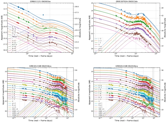 该团队收集了3个具有紫外、光学与近红外测光的伽玛暴-超新星(GRB 011121/SN 2011ke、GRB 130702A/SN 2013dx和GRB 161219B/SN 2016jca)的多波段数据,并用多波段余辉+镍模型拟合了它们的多波段光变曲线(如图)。