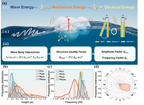 现阶段波浪能和TENG壳体机械能之间的能量转换关系还未有系统的研究。这导致基于现有评价因子设计的TENG在海浪环境中发电单元的摩擦层或接触层难以按照理想状态展开,导致器件可靠性差和电能转换效率低且不稳定的问题。另一方面,评判TENG器件波物耦合适配程度的标准尚未完善。这导致不同形状壳体间的波浪能吸收和转化能力难以比较。因此,有必要基于真实海浪的随机特性,从统计学和能量转化的角度提出量化评估壳体对波浪能吸收能力的结构品质因数。这对设计高效采集波浪能的TENG器件和内部采能方向的选择具有重要意义。为了解决上述问题,本文引入随机波浪理论和谱分析法,从统计学和能量转化的角度出发提出了用于定量评估海上漂浮式摩擦纳米发电机(Flo-TENG)壳体及其对波浪能吸收转化能力的结构品质因数(Qunit)。并根据海浪周期和波高的作用特性将其分为振幅结构品质因数(Qacc)以及频率结构品质因数(Qf)。此外,本文还系统性地研究了各个壳体参数对Qunit的影响。通过一系列的研究发现:波浪作用在器件的不同轴向上产生了不同的能量吸收和转化行为,即壳体对能量的吸收和转化具有轴向性;正方形器件的能量吸收主要来自Z向的贡献,四棱台、圆台和半球型器件的能量吸收主要来自三个轴向的共同贡献等。该成果以“Structural Quality Factor of Flo-TENG under Stochastic Wave Excitation”为题发表在学术期刊《Advanced Science》(IF=14.3)上,MOTV
