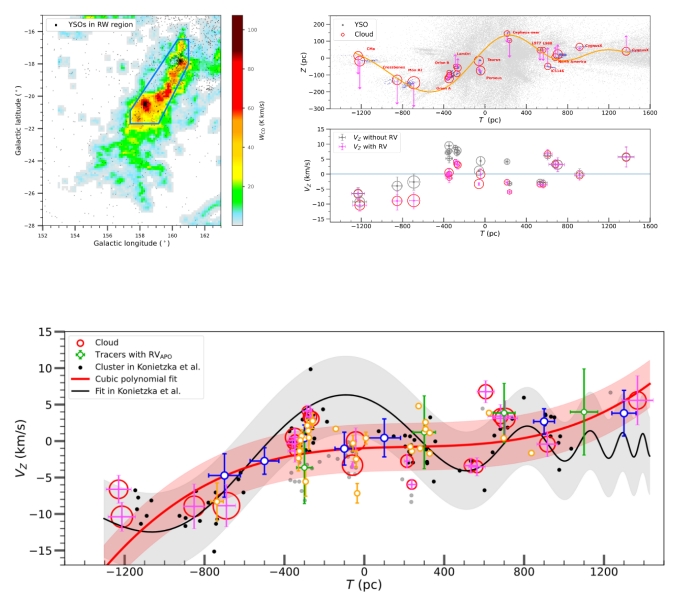 天体物理学方向研究生朱至锴与紫金山天文台、云南大学、巴塞罗那大学、达特茅斯学院等地合作者开展大尺度分子云结构的运动学性质的相关研究,成果以 “Updated Kinematics of the Radcliffe Wave: Nonsynchronous, Dipole-like Vertical Oscillations” 为题被《天体物理学杂志》(The Astrophysical Journal) 期刊接受发表。
