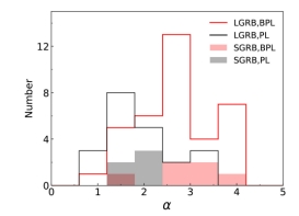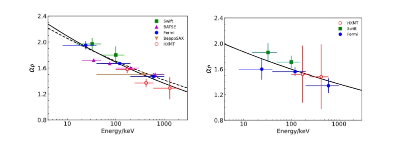 图1:长暴(左)和短暴(右)平均功率谱幂律指数随能量的关系