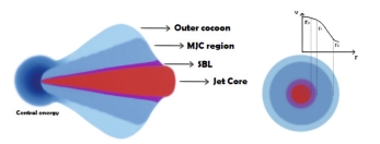基于模拟分析和最近的观测,在本文中我们提出GRB 射流具有由窄的极端相对论性核心和宽的亚相对论性茧组成的结构。我们表明,混合喷射-茧(MJC)区域中的剪切加速电子与核心中内部冲击加速电子产生的同步辐射及同步自康普顿(SSC)辐射,可有效解释瞬时伽马射线的光谱特征。