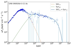 假设呈指数衰减速度分布,如果MJC区域磁场强度为100 G,内边缘速度为0.9c,则MJC区域的剪切流可以将注入的γe=300的电子加速到γe,max=104。这些电子的冷却主要由SSC过程控制,发射通量峰值在keV带。同时,假设喷流核心体洛伦兹因子为300,射流核心的磁场强度为10⁶G,内激波加速电子(γe=10⁴—10⁵)的同步辐射能量通量在keV−MeV带附近达到峰值。将射流核心和MJC区域的通量相加,总光谱能量分布(SED)显示出与伽马射线暴宽带观测相似的特征。我们提出的模型对GRBs 090926A、131108A和160509A中观察到的类双峰和Band函数截断式光谱进行了很好地描述。