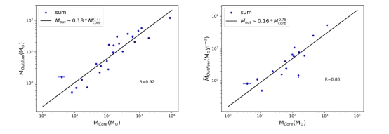 图2 左图为HCN 3-2示踪的致密外流分子气体质量与H13CN 3-2示踪的分子云核质量的关系图,右图HCN 3-2示踪的致密外流分子气体质量流失率与H13CN 3-2示踪的分子云核质量的关系图。