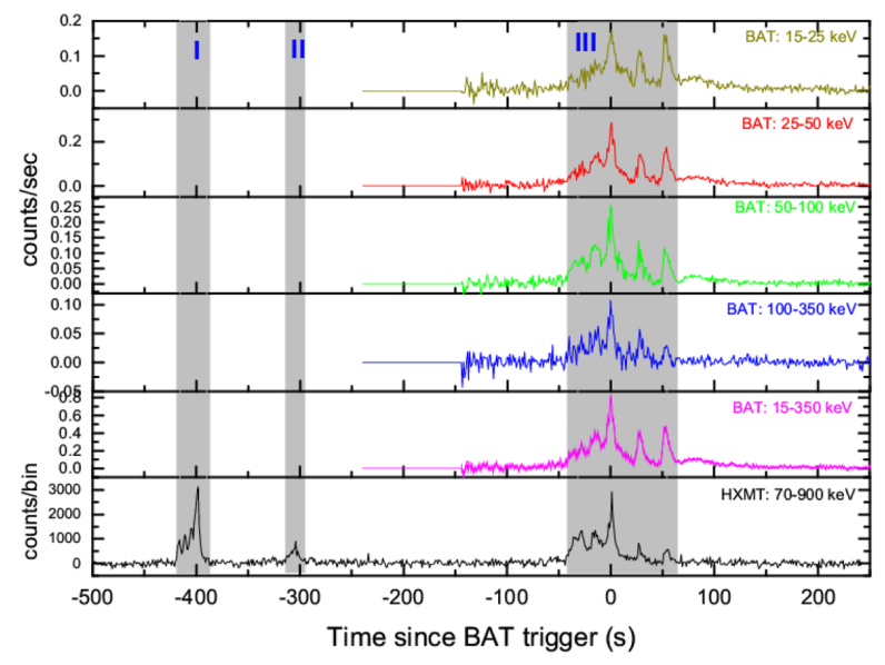 图1. GRB 240529 A在不同能带的Swift/BAT和HXMT光变曲线,时间bin为1秒。