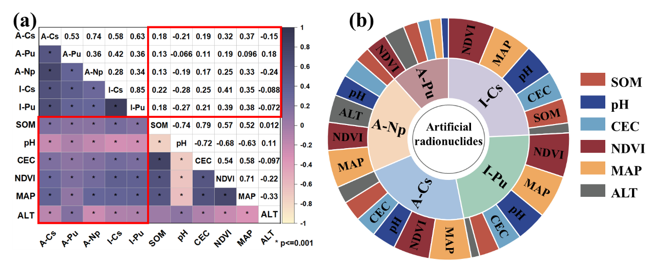 图3. (a) 137Cs比活度(A -Cs)、239+240Pu比活度(A - Pu)、237Np比活度(A- Np)、137Cs累积存量(I-Cs)和239+240Pu累积存量(I-Pu)与SOM、pH、CEC、NDVI、MAP和ALT的相关热图。(b)相关系数(a)的日暴图。