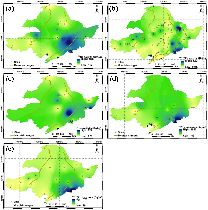 该研究聚焦于铯(137Cs)、钚(²³⁹⁺²⁴⁰Pu)和镎(237Np)在土壤和沉积物中的分布特征,揭示了它们与区域环境因子之间的关联性,为评估核素的环境行为及生态风险提供了科学依据。结果显示,(1)表层土壤中137Cs、239+240Pu和237Np的比活度范围分别为0.9 ~ 55 Bq/kg、0.021 ~ 2.8 Bq/kg和0.02 ~ 3.9 mBq/kg,其累积存量分别为823 ~ 3335 Bq/m²、57 ~ 336 Bq/m²和0.016 ~ 0.31 Bq/m²;(2)¹³⁷Cs和²³⁷Np的表层土壤比活度及其累积存量与土壤全有机质(SOM)、阳离子交换量(CEC)、归一化植被指数(NDVI)和年平均降水量(MAP)呈显著正相关,而与土壤pH值和海拔(ALT)呈负相关;(3)表层土壤中239+240Pu的比活度与SOM、CEC、NDVI和ALT呈正相关,但与pH值和MAP无显著相关性。