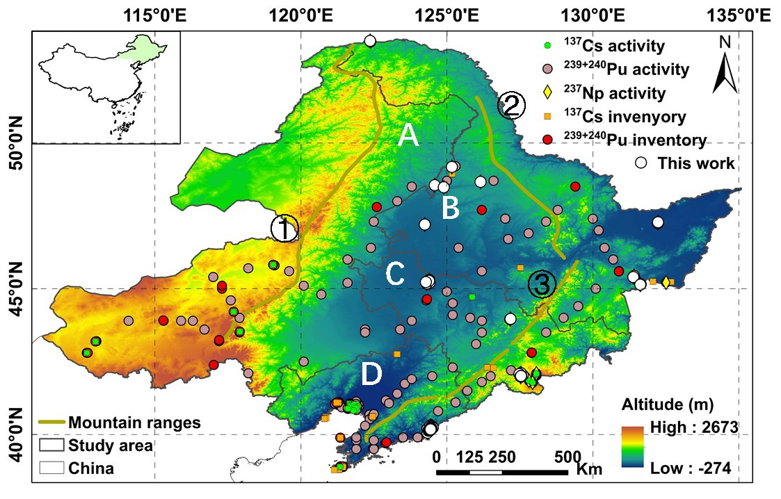 图1. 东北地区研究区域及采样点活度分布图。