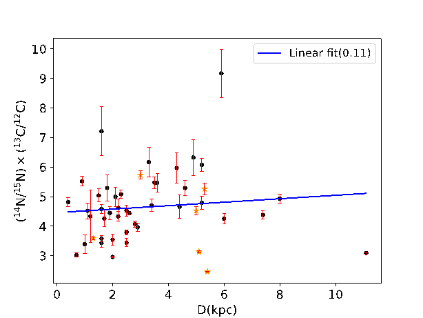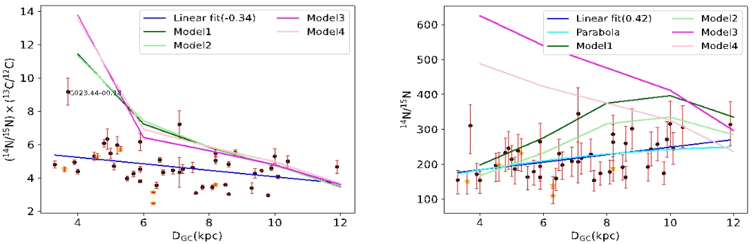 结果显示,(14N/15N)×(13C/12C)比值随着银心距的增加而呈现下降趋势,而与太阳距离则未观察到明显的趋势。同时,14N/15N比率呈现出随着银心距增加而增加的趋势。由于我们所测得的(14N/15N)×(13C/12C)比值相较前人具有更小的误差,因此我们的结果能够有效约束银河化学演化模型,特别是在DGC小于6 kpc的区域,银河化学演化模型与观测结果差异较大,我们认为星系化学演化模型关于14N/15N部分需要进行更新。
