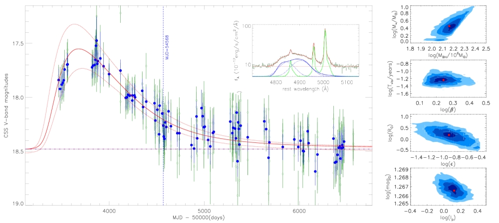 Fig. 1: Long-term light curve from the CSS and the TDE model determined best fitting results. The MCMC determined posteriors of the model parameters are shown in the right panels. The double-peaked broad Hβ and the best fitting results are shown the top right region of the left panel.