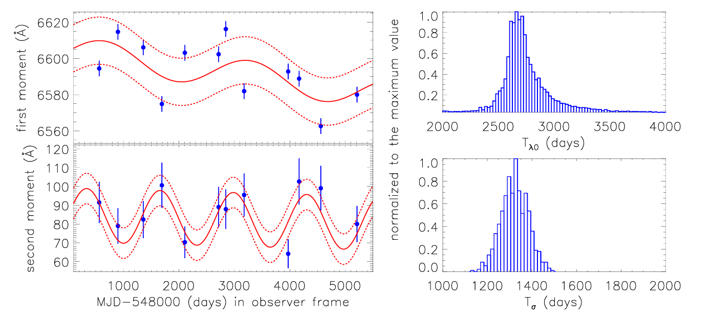 Fig. 1: Left panels show the variability of the first moment and the second moment of the double-peaked broad Hα in NGC1097. In the left panels, solid circles plus error bars in blue show the measured results through the 12 high quality spectra, solid and dashed red lines show the best descriptions and the corresponding 1RMS scatters. Right panels show the periodicity distributions.