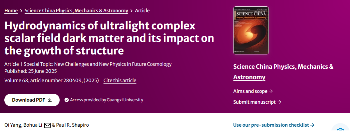 近日,我院宇宙学团队在暗物质研究领域取得新进展。研究结果以题目为“Hydrodynamics of ultralight complex scalar field dark matter and its impact on the growth of structure”的论文发表在中国科学院一区期刊Science China Physics, Mechanics & Astronomy (SCPMA)。论文的第一作者为MOTV