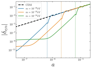 暗物质在宇宙大尺度结构的形成和演化过程中扮演着极其重要的角色,超轻暗物质是其主流候选体之一。我院宇宙学团队立足于复标量场超轻暗物质,针对其不同于传统轴子暗物质的非理想流体特性,开创性地采用了Eckart参考系(也就是粒子输运速度作为暗物质流体速度)与相对论性流体的刚性规范(stiff gauge),成功构建了该暗物质模型在宇宙学微扰论下的流体力学理论框架,并以此分析了其宇宙大尺度结构的早期演化特征。