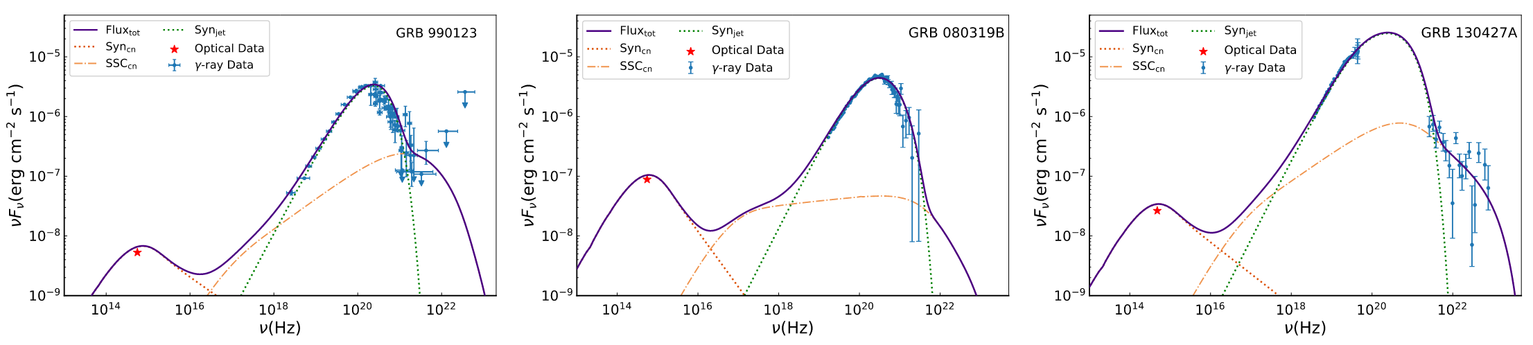 图1:伽马射线暴990123、080319B和130427A在光学、X射线和伽马射线波段的瞬时发射光谱。