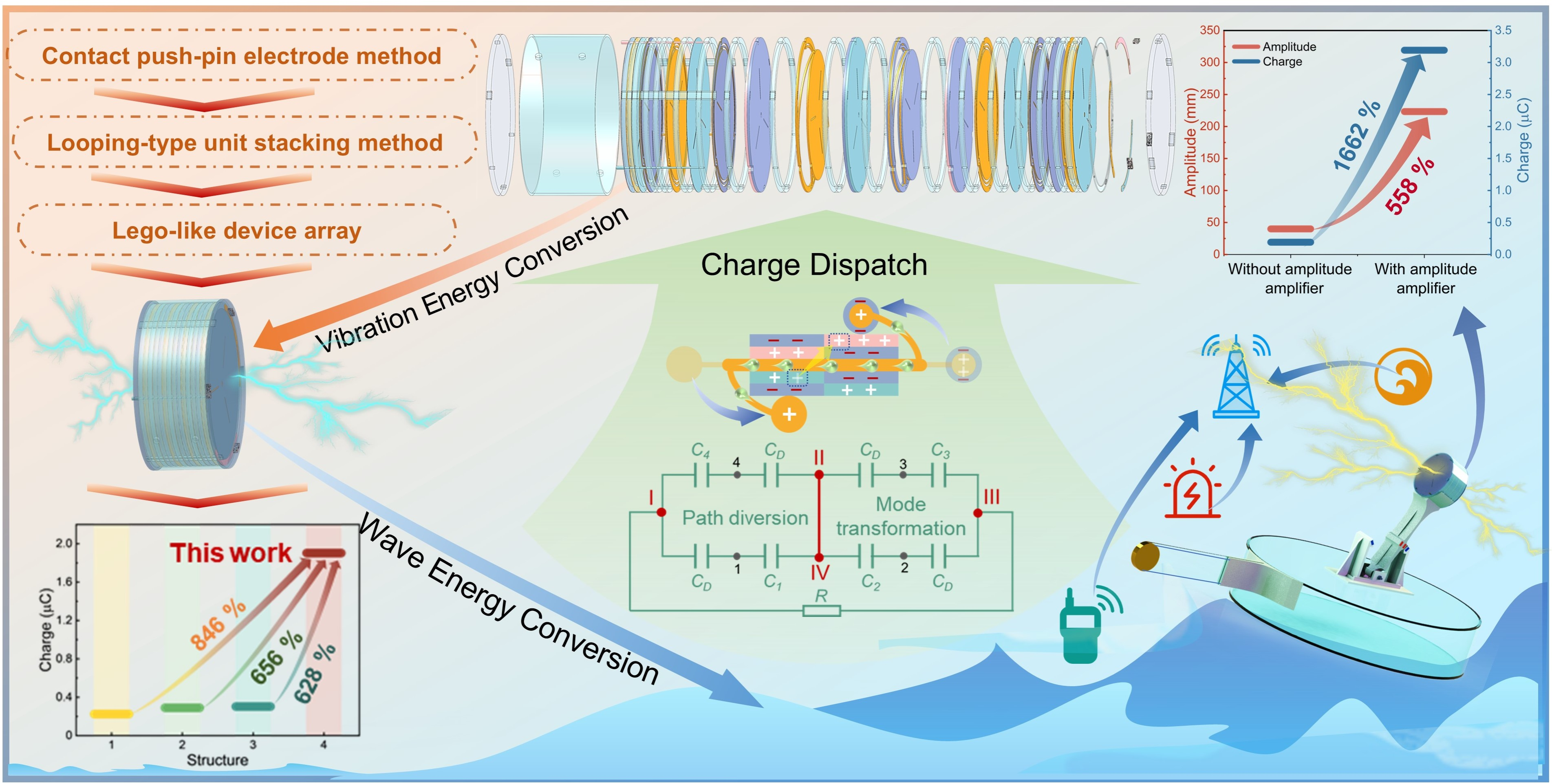 为此,本文提出了一种拨浪鼓启发的摩擦纳米发电机(RD-TENG),在高密集叠层中构建以三电极端口与交替覆膜策略为结构载体的电荷调度策略,使得自由电子可在内电极间循环间迁移,实现微观上电荷分流以克服电荷抵消现象和宏观上的模式转换以有效抑制固有静电屏蔽效应,从而显著提升外电极输出6倍以上。结构优化使 RD-TENG 的密集化集成度(TSD)达 2.76 cm-1:采用激光镂刻制备的一体化振动钢片以弹性悬臂梁构建简谐振动;电极间采用触点顶针法去导线化导通;单元间通过套圈式快捷逐层堆叠拼装方法实现标准化快速拼装;器件间使用旋转锁扣法实现模块化快速阵列网络,显著提升了集成度、输出性能、制备工艺与稳定性,并降低了制造成本。经理论与结构优化,RD-TENG 实现了 136.74 W m-3的体积峰值功率密度和电荷体密度VCD = 11.69 mC m-3,可高效收集机械能为电子设备供电。基于结构、电学及应用导向指标建立的综合评价体系表明,其整体性能优于同类研究。为拓展其在宽频、低幅及随机波能等复杂场景的适应性,设计了降频增幅磁斥力摆(MRP),可将高扭矩低振幅的波浪运动转化为低扭矩高振幅的摆动,降低启动频率的同时增加工作振幅,在同一激励条件下,器件运动振幅与输出性能分别提升558%与1662%,波能收集频率带宽可压缩至0.4 Hz,振幅响应可降至6 mm,角度响应可降到4°,实海测试验证了其在平缓海况下的稳定发电能力。进一步的节点技术路线完善图谱可为TENG在海洋能应用中各节点理论设计和研究方向提供了系统指导和参考,采用的正交试验法也可为TENG领域引入了新的实验技术与研究方法。
