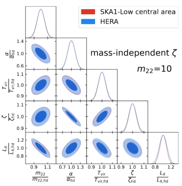 本工作利用费舍尔信息矩阵范式,使用代码21cmSense分别模拟得到HERA和SKA1-Low两个射电干涉阵列观测的灵敏度。结合21厘米理论功率谱,研究表明下一代射电观测有可能在95%置信度水平将超轻暗物质粒子质量限制到10%以内,该优异结果为暗物质射电天文探测这一重要科学目标提供了有力支持。